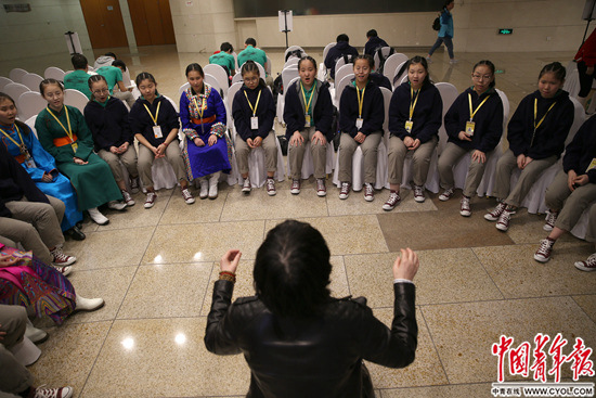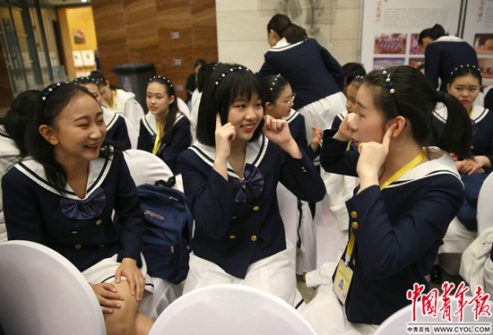 北京市第171中学金帆合唱团的团员在候场时玩游戏放松。
