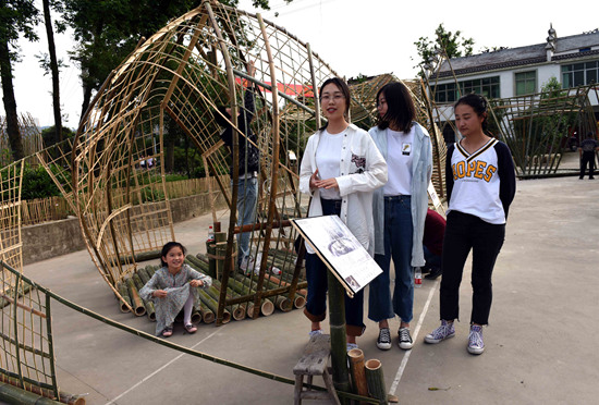 5月19日是全国旅游日,安徽省庐江县汤池镇百花村文创谷格外热闹,游客们在这里欣赏16件竹器建筑物,它们是由全国十余所高等院校的100多名大学生走进汤池镇百花村,利用当地特产毛竹创作的精品建筑作品。周跃东/摄