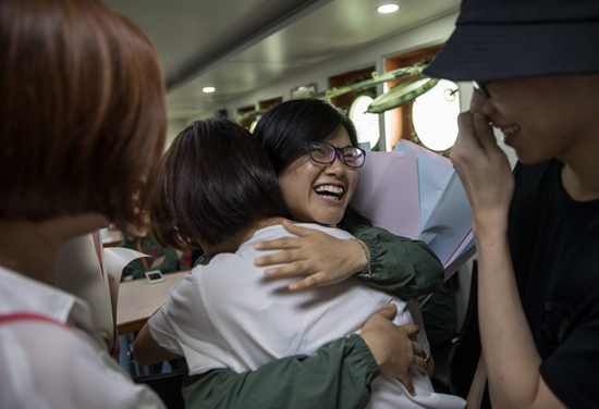 5月20日上午,广州,在历时62天航行、遭遇暴恐事件后,中科院南海海洋研究所“实验3号”科学考察船完成东印度洋海洋学综合调查航次考察计划,返回广州新洲码头,前来接船的队友和亲友迎接归来的科考队员。4月21日上午,斯里兰卡科伦坡等地连续发生多起爆炸,等待登上该科考船的中科院南海海洋所高级工程师李健和潘文亮遇难,3名职工、学生受伤。视觉中国供图
