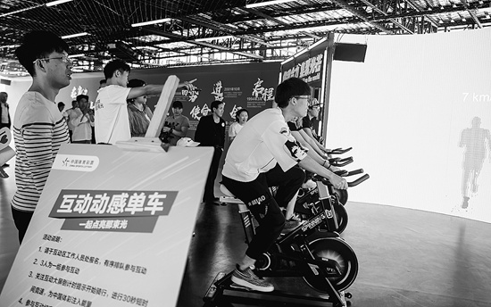 5月10日,在武汉光谷步行街,参与活动的市民在世界冠军的号召下,加入30秒自行车竞速骑行,为公益体彩添油助力。