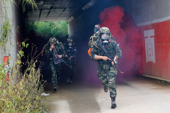 “快速潜入,制服犯罪嫌疑人,开始行动!”随后,作战小分队队员快速奔向目标,进行控制,而右翼分队在收到指挥员的指示后早已在嫌疑人附近进行警戒监视。特战队员穿过封锁线,跨过障碍,躲过空地侦察,不断向“敌”纵深突击。