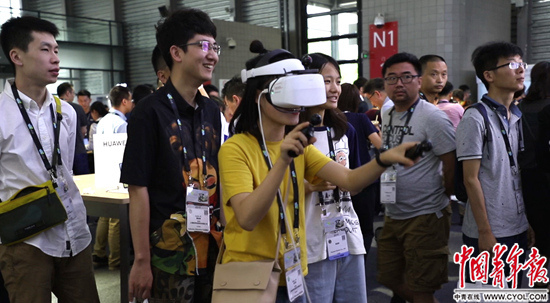 观众排队体验HUAWEI VR2 VR头显设备。程鸿鹤/摄