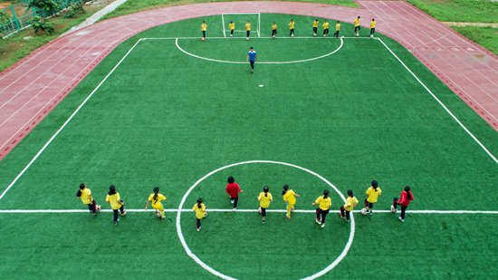 学生们在上足球课(无人机拍摄)。 新华社记者 胡超/摄