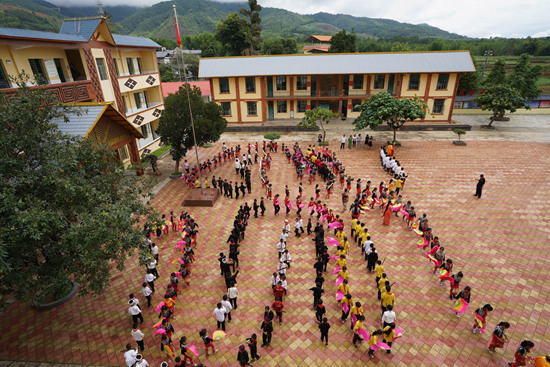 学生们在课间操时跳民族舞。 新华社记者 秦晴/摄