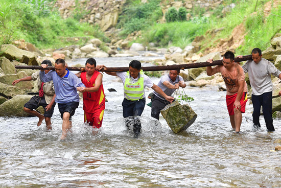 乌英苗寨的驻村第一书记韦桂华(右四)、党员梁成兵(右三)、梁志新(左二)带领村民维修河堤(6月30日摄)。乌英苗寨位于黔桂交界的大苗山深处,共有140户600多人。其中100户属广西柳州市融水苗族自治县杆洞乡党鸠村,40户属贵州省从江县翠里瑶族壮族乡南岑村。由于地处偏远,山多地少,脱贫攻坚任务艰巨,目前整个苗寨还有59户贫困户。新华社记者 黄孝邦/摄