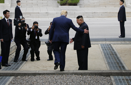6月30日,正在韩国访问的美国总统特朗普在板门店与朝鲜最高领导人金正恩握手会面后,跨越军事分界线来到朝方一侧。新华社/纽西斯通讯社
