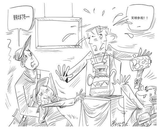 博物馆遇上熊孩子怎么办?每到假期,博物馆常常发生孩子追逐打闹、大声喧哗的情况。日前,有游人在广东省博物馆的留言本质疑:“工作人员管得好多啊!”“不给吃东西,又不让孩子跑!”“观众不是上帝吗?”对此,广东省博物馆回应,在博物馆遵循相关礼仪规范是对他人的尊重,“博物馆礼仪,从娃娃抓起”。(中国新闻网8月2日)漫画:徐简