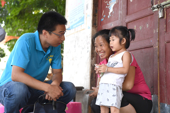 “接棒”黄文秀担任广西乐业县百坭村第一书记的杨杰兴(左)向村民了解孩子上幼儿园的情况(8月1日摄)。就任百坭村第一书记前,杨杰兴是同乐镇扶贫工作队分队长。