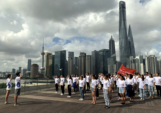 7月19日,即将出征的大学生志愿者在上海外滩进行志愿服务宣誓。新华社记者 刘颖/摄