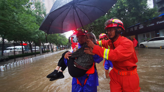 8月11日,救援人员在山东省滨州市滨城区一积水路段救助被困车内的九旬老人。受冷空气及台风“利奇马”外围云系影响,山东部分地区出现暴雨。 陈鹏宇/摄(新华社发)
