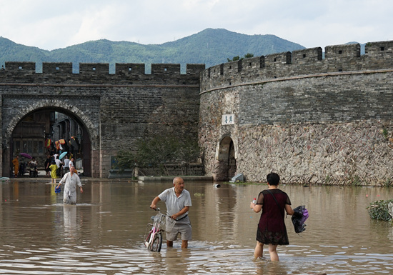 •     8月11日,临海老城居民从仍有积水的“兴善门”门前经过。受超强台风“利奇马”影响,浙江临海老城区内有着1600多年历史的台州府古城墙遭受洪水围困,有关部门和各种救援力量正尽全力抢险救灾。新华社记者 翁忻旸/摄