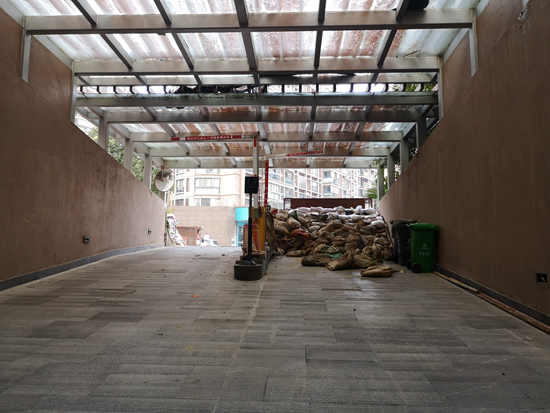 他是附近高中的教师,想下楼看看水情就回家,这时在车库入口,人们已经筑起高约1.2米的堤坝,外面的水位还在缓慢上升。水也渗进了堤坝,一部分水被出口处的水泵抽走了,剩下的沿着斜坡灌入排水沟,车库深处花坛区域,地面还是干的。