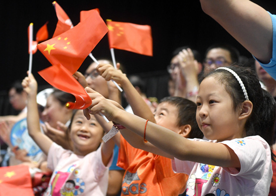 8月24日,小朋友们在活动中挥舞旗帜。以“止暴制乱,恢复秩序,守护香港,家庭同乐”为主题的“家庭同乐日”启动仪式24日在香港海洋公园拉开帷幕。在国歌声中,800多名香港各界代表、中资企业员工、香港市民全体起立,大家挥舞手中的国旗和香港特区区旗,共同庆祝新中国成立70周年。 新华社记者 卢汉欣/摄