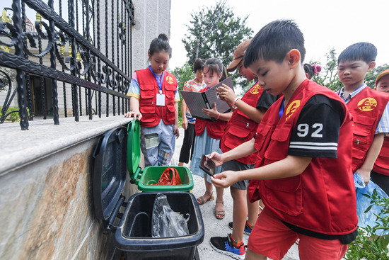 8月28日,小志愿者们在查看垃圾桶并根据垃圾分类情况进行打分。从7月份开始,浙江省长兴县林城镇上狮村成立了年龄在9~12岁的小小志愿者团队,开展“小手拉大手共建美丽家园”活动。新华社记者 徐昱/摄