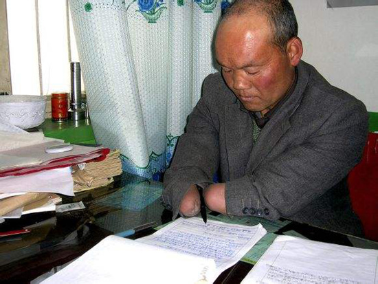 老师在教室里专门为马复兴安排了两张桌子,一张高、一张矮。矮桌子上摆上书本,马复兴坐在较高的桌子上,左脚压住纸,右脚夹住笔,吃力地写字。