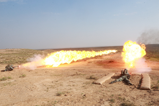 8月24日,第76集团军某旅防化兵喷火考核在大漠戈壁进行。随着指挥员一声令下,一道道“火龙”呼啸而出,对“敌”暗堡、堑壕、火力点等重要目标实施打击,有效提升了部队实战化训练水平。袁宏彦/摄