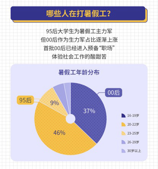 报告显示,暑假工主力集中在95后、00后群体。16岁~22岁的暑假工占整体从业人员的83%,他们中大部分为在校大学生。