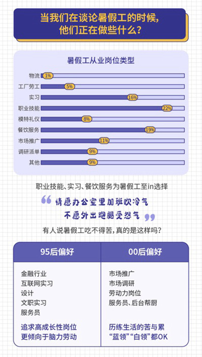 其中,95后感受到的就业压力更明显,他们注重成长与规划,即使是兼职也希望能为自己增益镀金。而一般的暑期工岗位,难以达到他们的期待。