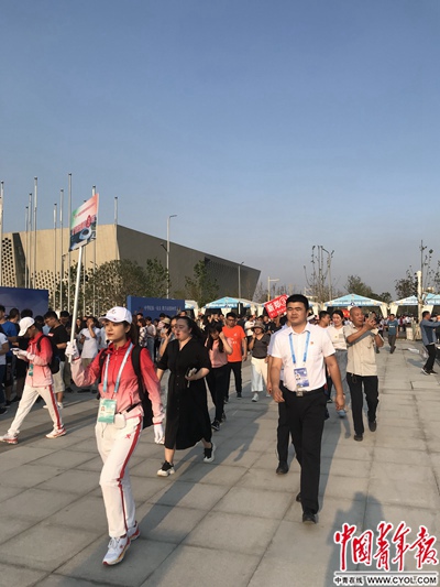 志愿者到观众乘车点进行接送观众演练,引导观众有序入场。