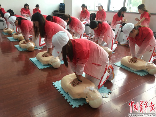急救医疗志愿小队的志愿者接受业务培训。