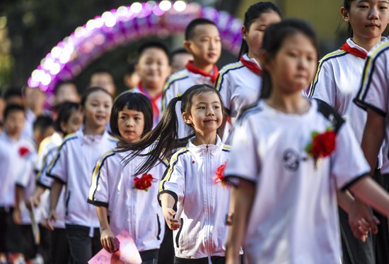9月4日,新疆教育学院实验小学举办主题为“梦想从这里启航”的开学典礼,一年级新生在六年级学生的引领下走进校园。新华社记者 王菲/摄