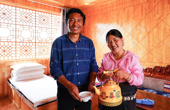 在甘肃省甘南藏族自治州碌曲县尕海镇尕秀村,旦增昂杰和尕藏草(右)夫妇在自己开办的“藏家乐”中(8月27日摄)。近年来,甘南州用打造生态文明小康村的方式,提高旅游附加值,延长旅游产业链。新华社记者 陈君清/摄