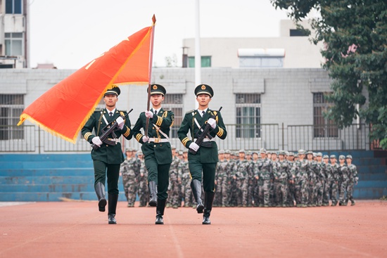 西北大学2019级新生军训汇报总结大会上,护旗手高举国旗带领各方阵进行分列式受阅。西北大学 马骞/摄