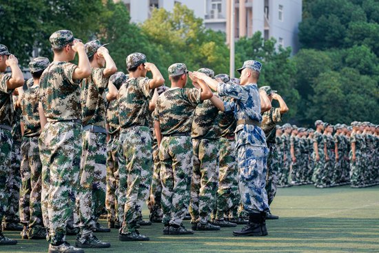 军训第一天,华中农业大学军训教官正在指导新生行军礼。华中农业大学 王梓安/摄