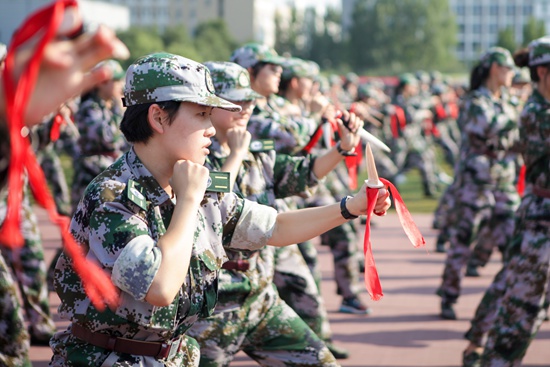 中央财经大学女子匕首操的训练场上,一位短发的女队员认真刻苦地反复训练着。中央财经大学 赵昕宜/摄