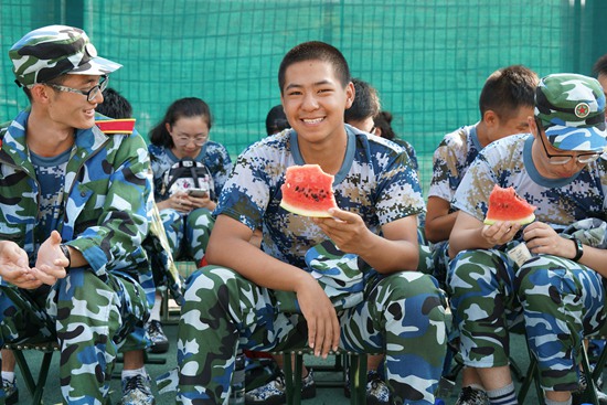 大连理工大学军训期间,学兄学姐为大一的军训新生送来西瓜解暑。大连理工大学 任泮虹/摄