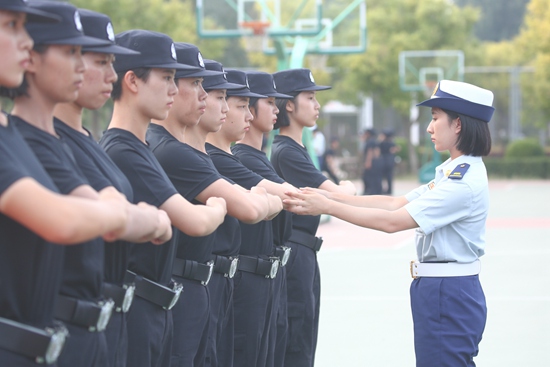 中国人民警察大学新生强化训练中,一位女教官正在细心调整新生手臂姿势。中国人民警察大学 杨珂雯/摄