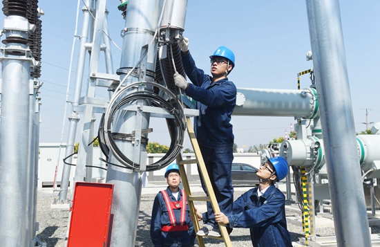 9月22日,安徽滁州来安县110千伏苗圃变电站,技术人员正在对站内通信进行调试。滁州110千伏苗圃变电站的建成投运,也是滁州电网建成投运的第1座室外110千伏GIS模块化变电站。视觉中国供图