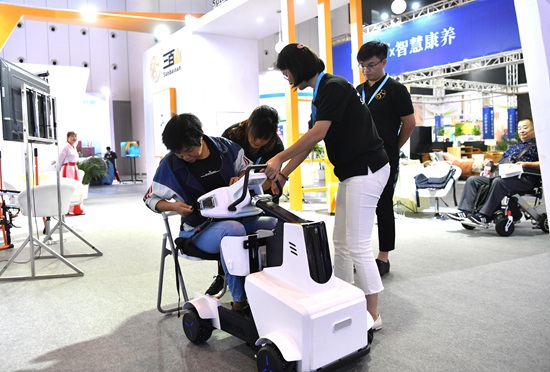 9月20日,第三届中国西部国际博览会进出口商品展暨中国西部(四川)国际投资大会在成都开幕。图为市民在展会上体验康养产品。
