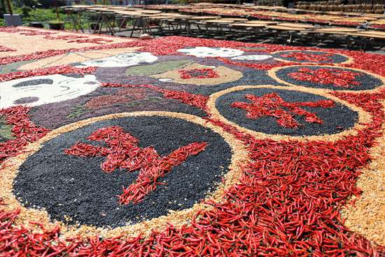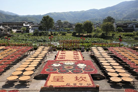 永兴湖畔的晒秋广场中央,“呈坎晒秋”的巨幅主题图案格外醒目——一位慈祥老者与两侧的孩子手捧满怀的丰收成果。这幅喜庆的画是由各类作物组成的,并摆出“己亥中国”“农民丰收节”红黄相间的字体,红的是辣椒,黄的是玉米,寓意红红火火、金玉满堂。