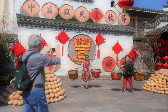 本报讯(中国青年报·中国青年网见习记者 李怡)9月23日,时值秋分,也迎来第二届中国农民丰收节,黄山市徽州区呈坎镇的晒秋场景热闹非凡。