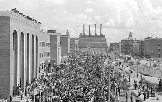 1956年盛夏,第一批解放卡车下线。欢呼的人们把道路围得水泄不通。