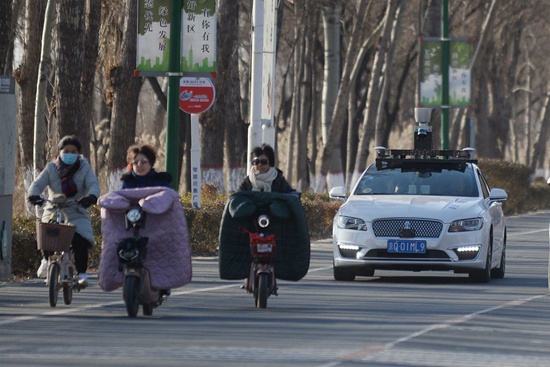 2017年冬天,百度Apollo自动驾驶车辆在雄安新区的测试路段上试行。视觉中国供图