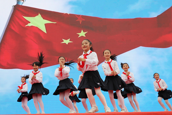 10月12日,重庆市沙坪坝区“红领巾心向党 争做新时代好队员”庆祝中国少年先锋队建队70周年活动在重庆大学城第一小学校举行。图为少先队员表演文艺节目。孙凯芳/视觉中国