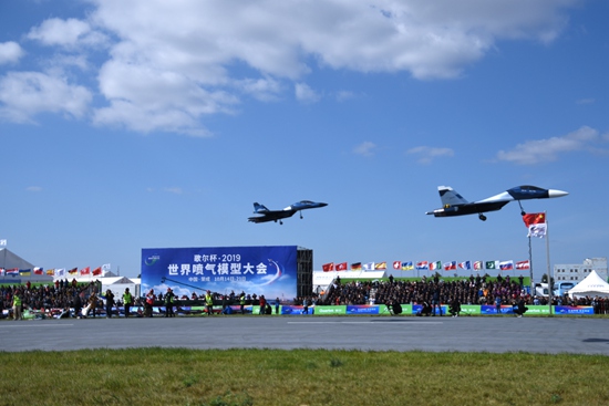 10月14日,山东省威海荣成市樱花湖体育公园,国际飞手正进行航空飞行特技表演。当日,2019世界喷气模型大会暨荣成航空嘉年华在此举行。视觉中国供图