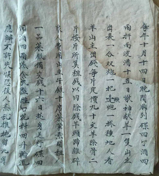 三、每年农历十月十四日晚间,村民需准备好四碟菜、四两酒、擀面菠菜汤,种地人献羊一只(山主出钱),山主出表一合、双炮一把、鞭炮一挂;众人负担的费用包括十月十五日山主午饭十席荤素,十月十六日山主起身送行菜四碟、酒四两、蒸食两盘,牲口饲料四升等。