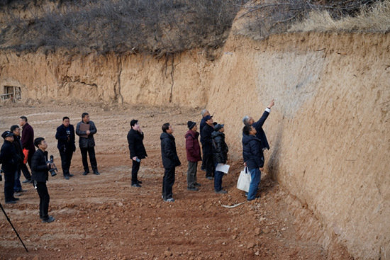 中国社会科学院考古研究所专家何努(右一)、临汾市文物局专家李兆祥在察看北尧山陶寺时期的灰坑。