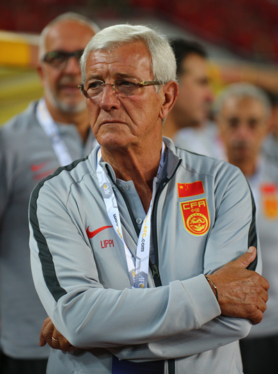 10月10日,国足主教练里皮在场边观战。视觉中国供图