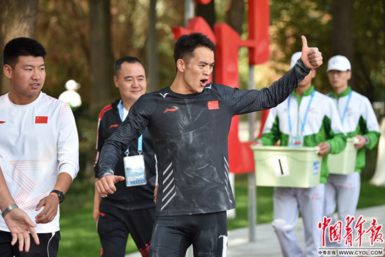 10月24日,在武汉军运会空军五项障碍跑比赛中排名第一的中国选手叶邦武,赛后伸出大拇指庆祝自己取得优异成绩。中国青年报·中国青年网记者 慈鑫/摄