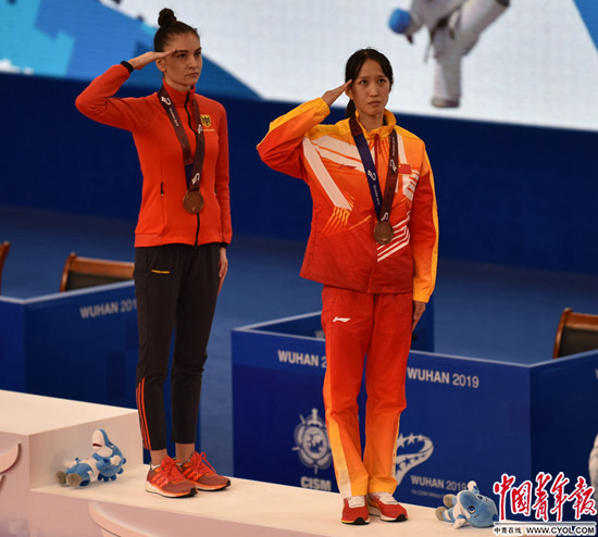 中国选手李照艺(右)在武汉军运会女子跆拳道49公斤级比赛颁奖仪式上,她与德国选手艾拉(左)获得该项目并列第三名。中国青年报·中国青年网记者 慈鑫/摄