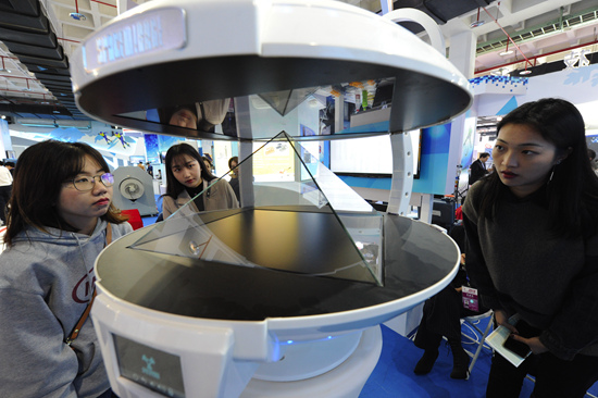 10月24日,参观者在观看360度裸眼3D全息投影仪。