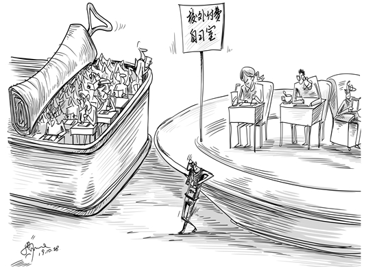 离最近一次考研只有短短2个多月了,“考研党”也进入了最后的冲刺时间,但占座是每位学生都面临的难题——放课本,贴纸条,为了占一个座位,他们想出了各种办法。这一两年来,在校外的“付费自习室”也悄然兴起,给学生们提供了一个新的去处。有考研学生认为:“一杯奶茶的钱可以复习一天,划算。”(中安在线10月26日)漫画:徐简