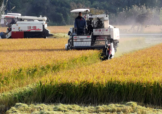 10月27日,江苏省扬州高新技术产业开发区晚稻农田一派繁忙秋收景象。“霜降”过后,全市晚稻陆续进入收割季,机械化收割作业,不仅大大提高劳动效率抢抓农时,又有效解决了焚烧污染环境的“老大难”问题。视觉中国供图