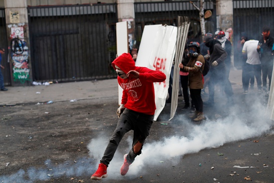 当地时间11月4日,示威者在智利首都圣地亚哥与防暴警察发生冲突。由“地铁票价上涨”引发的抗议活动,现已演变成严重暴力冲突,智利多地进入紧急状态并实行宵禁。视觉中国供图