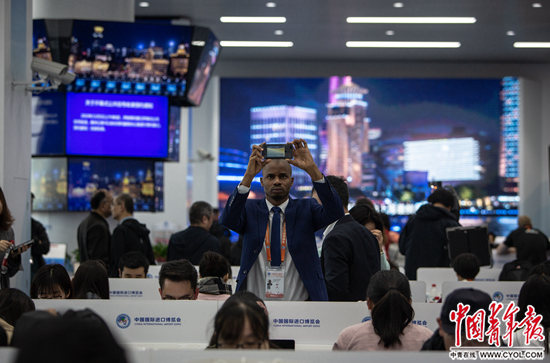 11月5日,上海国家会展中心新闻中心,第二届中国国际进口博览会开幕式即将开始,一名来自冈比亚的记者用手机拍摄屏幕。中国青年报·中国青年网记者 李峥苨/摄
