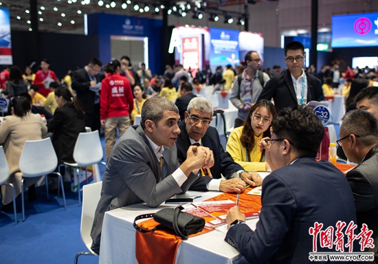 11月6日,上海国家会展中心,第二届进博会供需对接会上,来自埃及的参展商与采购商交谈。当天上午,持续三天的进博会供需对接会拉开帷幕,将为参展商提供每天8小时与采购商“1对1”现场对接洽谈服务。对接会开始后不到两小时,现场签约数就已达130余项,达成意向数超200项。中国青年报·中国青年网记者 李峥苨/摄